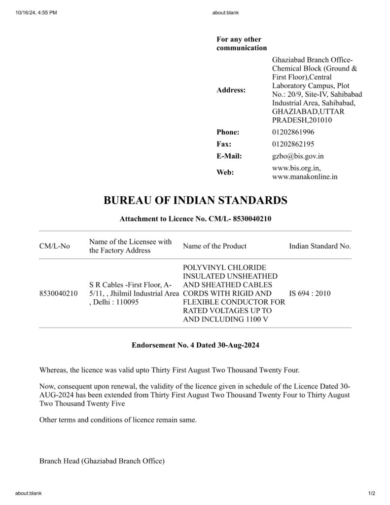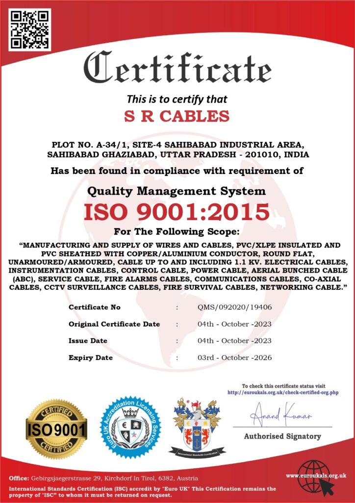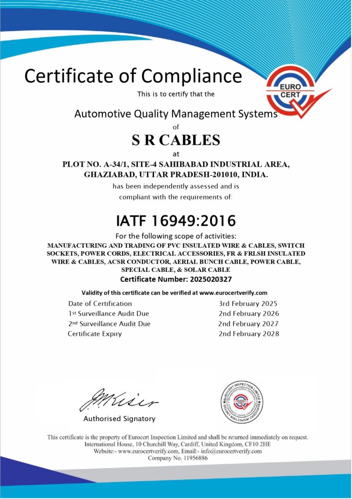 We are located in Sahibabad Industrial Area, Ghaziabad, India, are IATF 16949:2016 certified for automotive quality management. The certification covers PVC insulated wires, cables, power cords, and accessories. Issued by Eurocert Inspection Limited, it’s valid from February 3, 2025, to February 2, 2028.